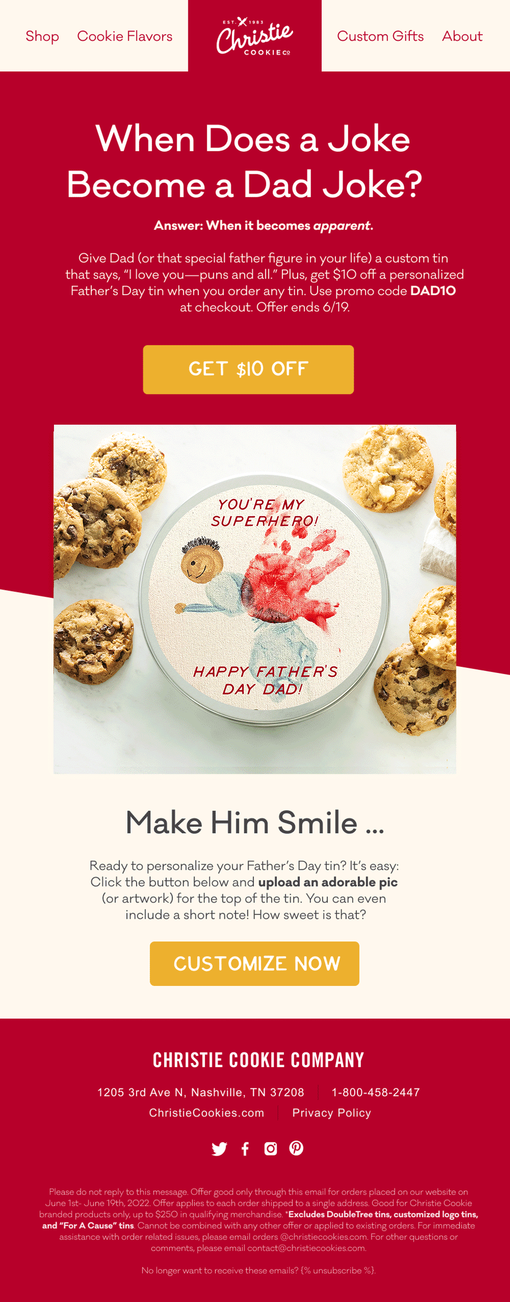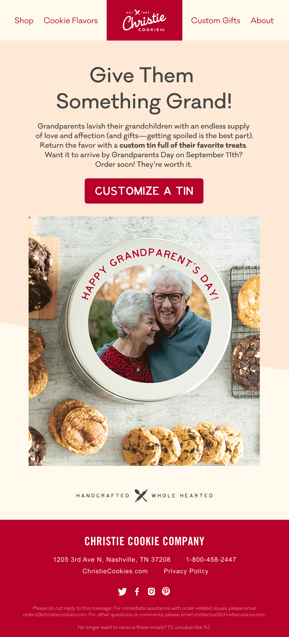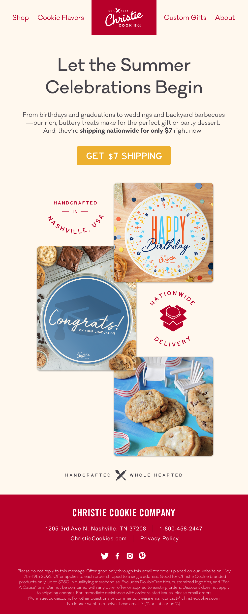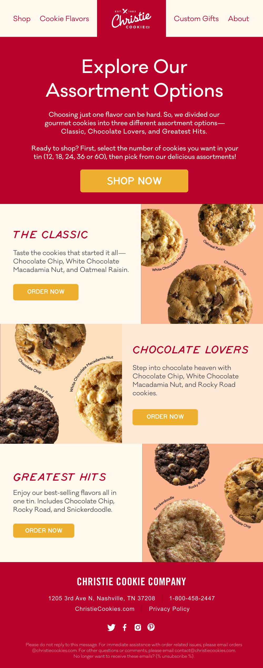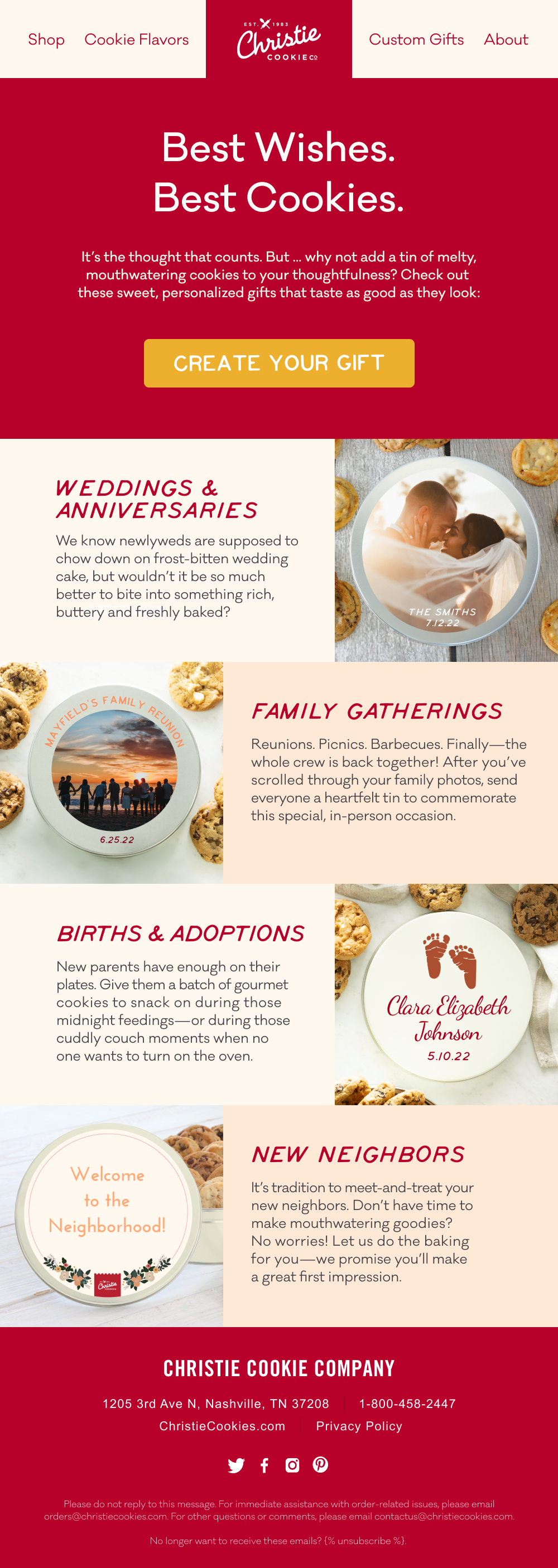 MONTHLY EMAIL CONTENT CREATION FOR CHRISTIE COOKIE, ASSETS CREATED INCLUDE GIFS, ILLUSTRATIONS, AND TIN DESIGNS.