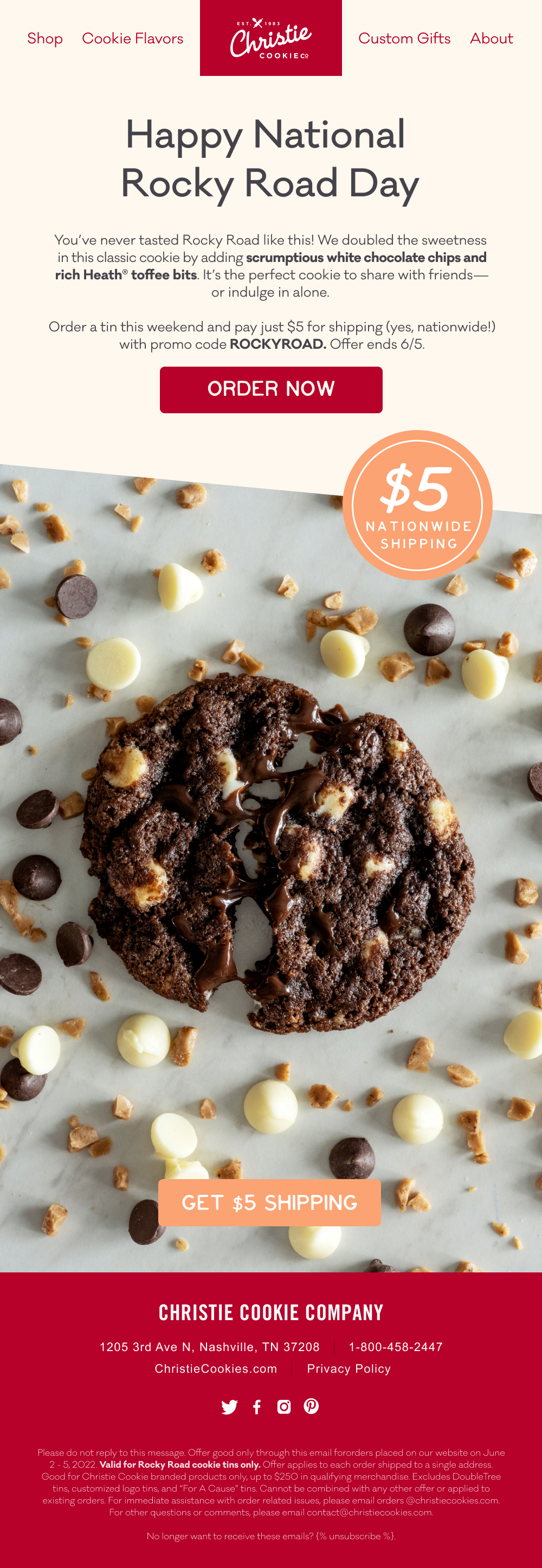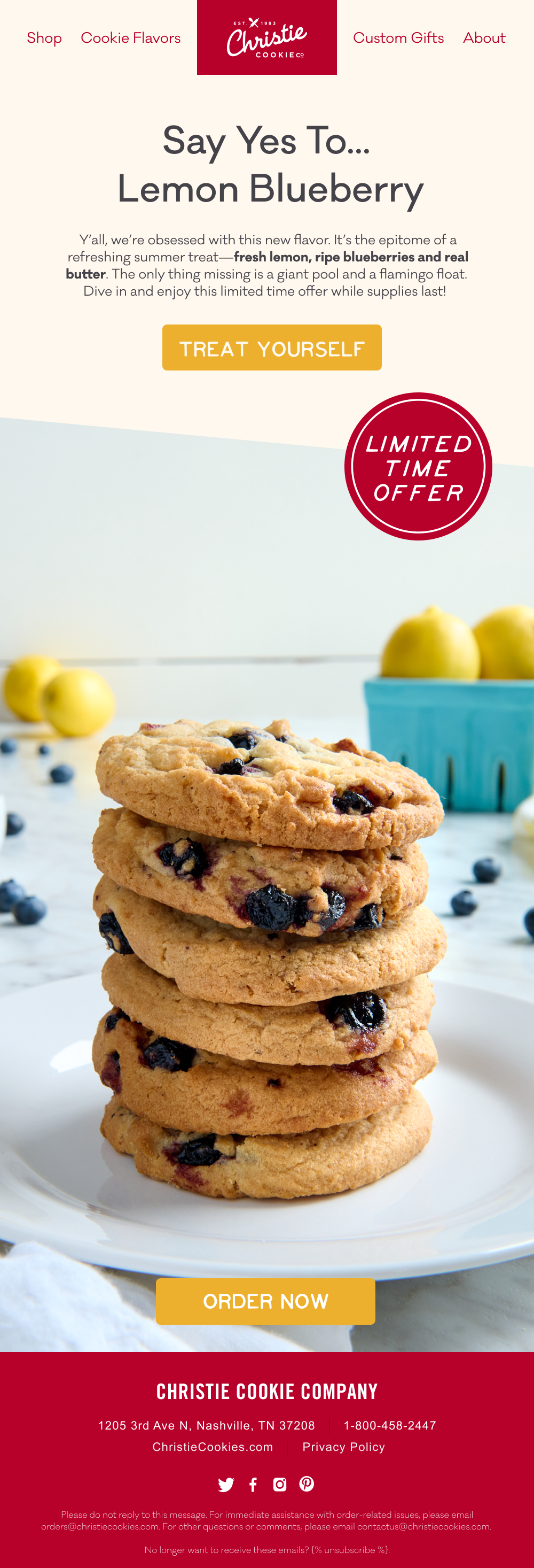 Monthly email content creation for Christie Cookie. Assets created include GIFs, illustrations, and tin designs.